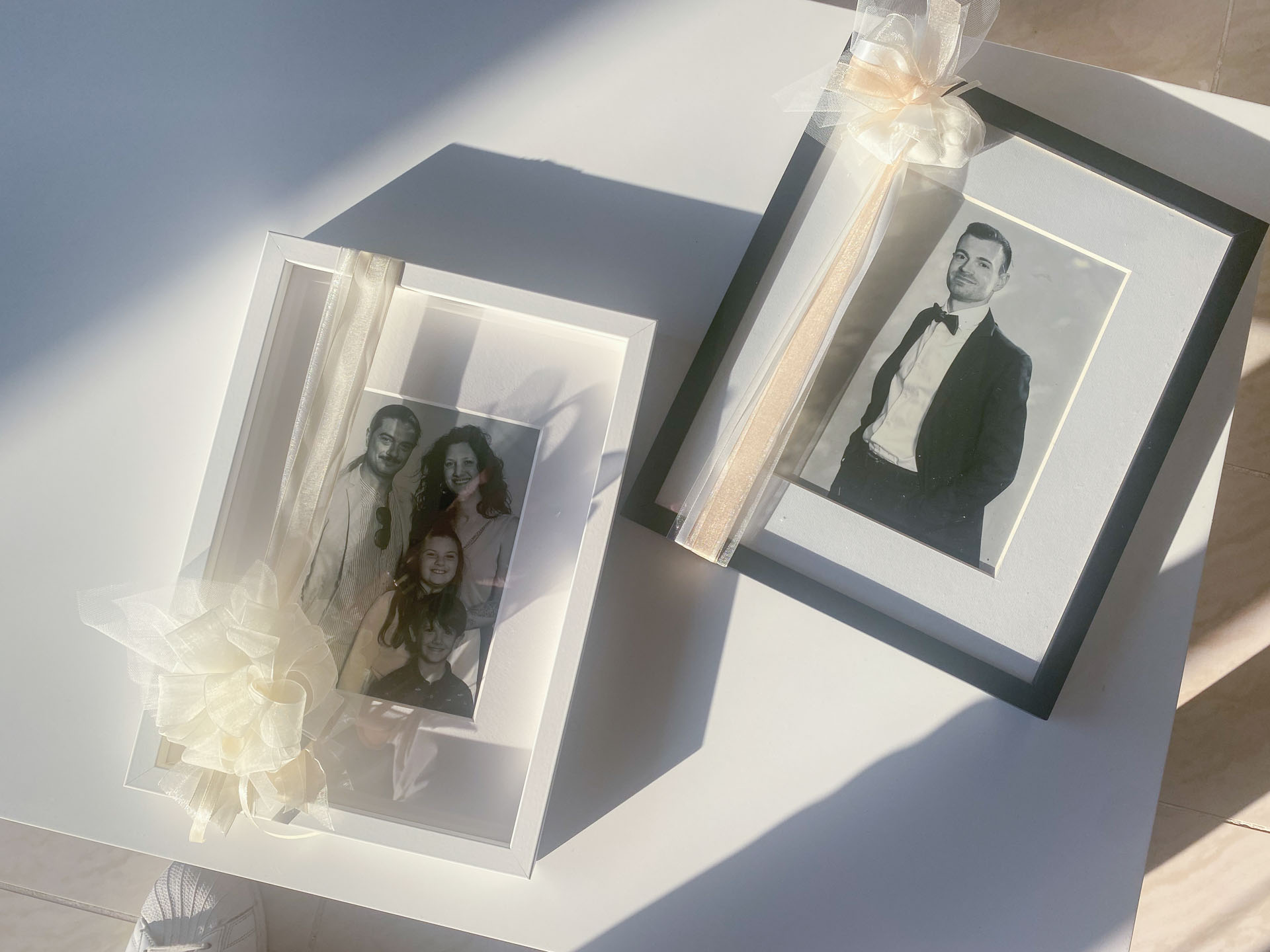 Successivamente le fotografie vengono postprodotte, stampate in bianco e nero e rifinite su una cornice preparata per il vostro matrimonio con nastri, fiocco, tag personalizzato e dettagli coordinati al vostro stile.